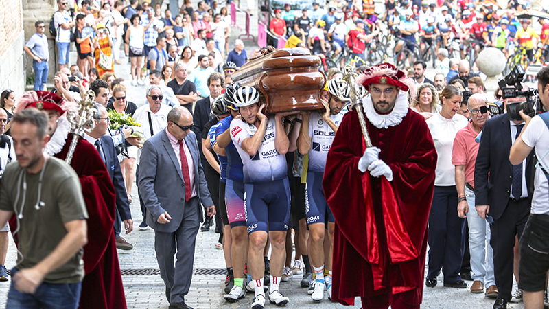 La comitiva fúnebre, custodiada por ciclistas que han querido acompañar al “Águila de Toledo” en su despedida, ha avanzado con dirección hacia el Ayuntamiento y se ha detenido en El Miradero, donde se encuentra la estatua en su honor.