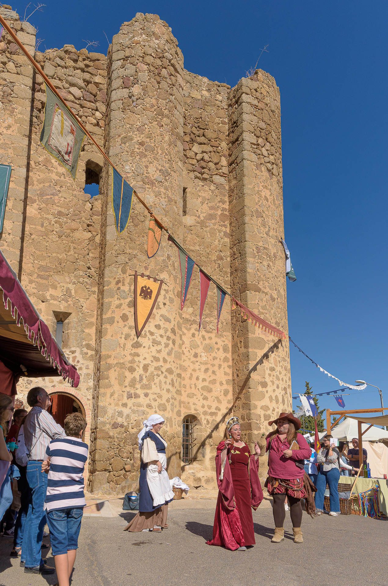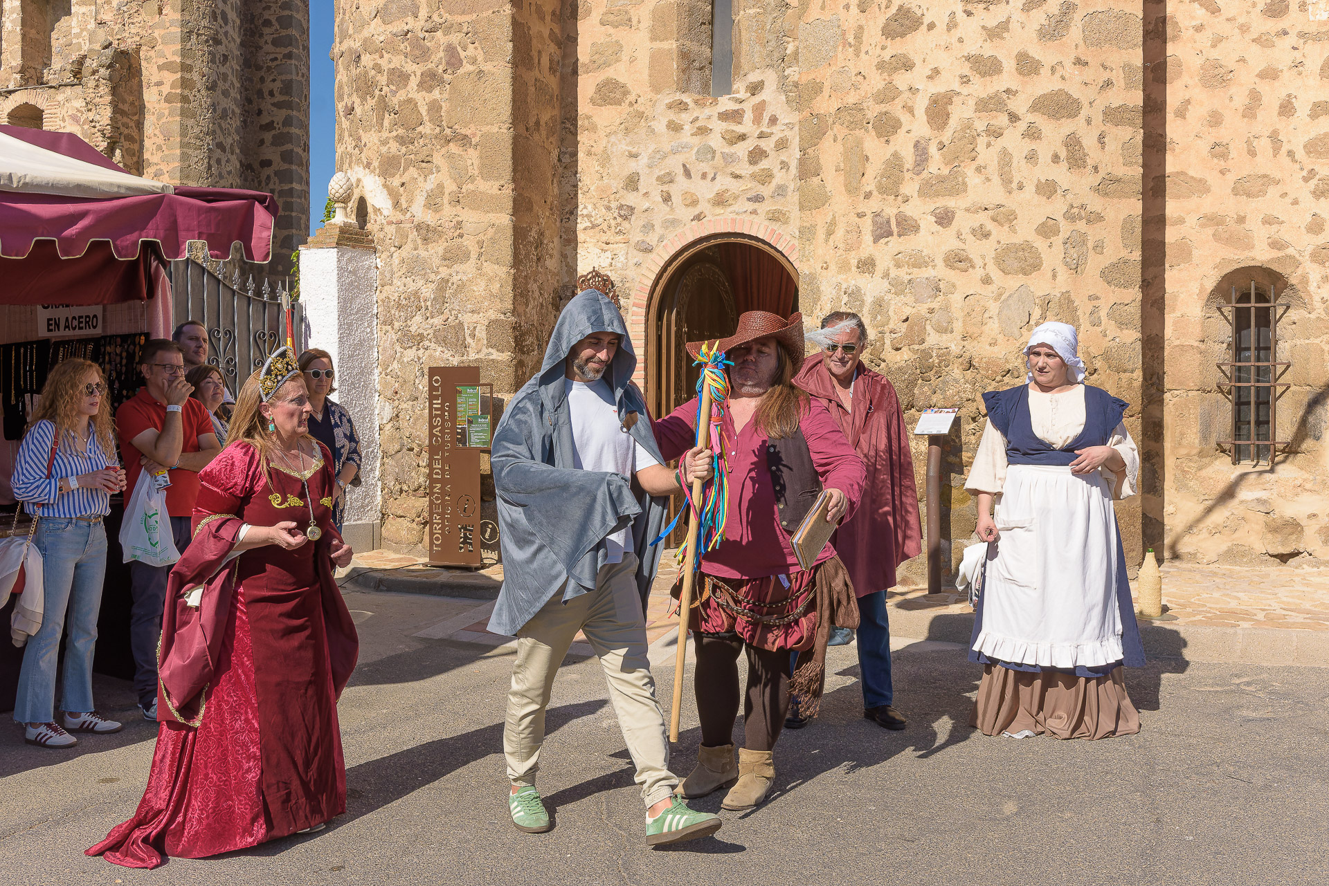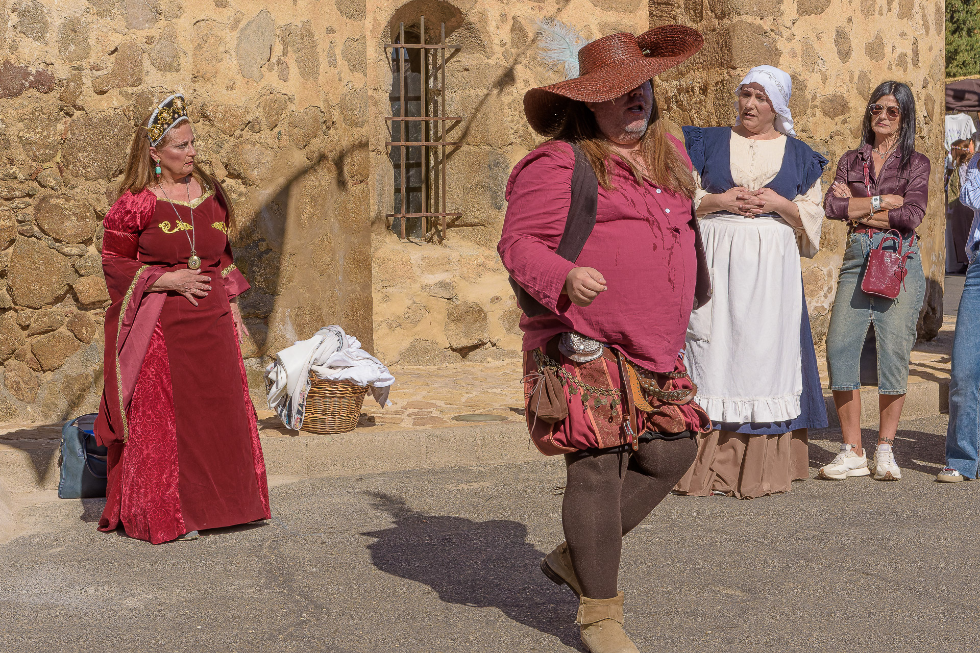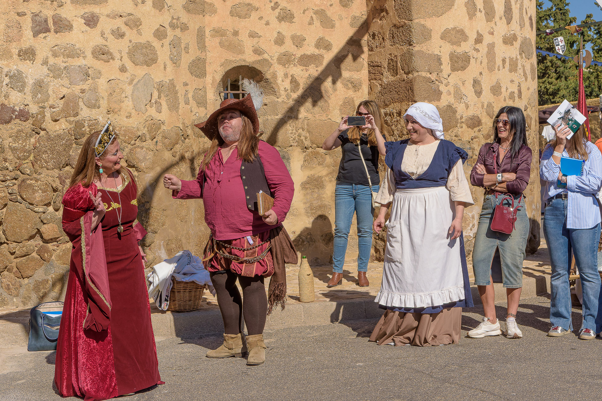 Desde la iglesia nos encaminamos al castillo, que constituye el elemento patrimonial más significativo de la villa y una pieza de notable singularidad dentro de la arquitectura militar medieval de la península. en la puerta del castillo sería en donde aparecería un curioso y divertido personaje llamado «Crispín de malcuerno», bufón del rey y encargado de darnos a conocer la historia del Castillo y del poeta y cortesano Lope de Zúñiga y de su esposa, Mencía de Guzmán, ilustres propietarios del castillo. Lope de Zúñiga sería el siguiente personaje en aparecer en escena en el interior del torreón del Castillo, antes de pasar al que fue el patio de armas en donde la Asociación Baucan nos realizó un fantástica exhibición de lucha medieval.