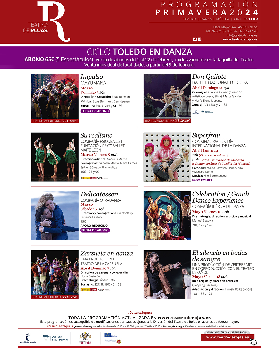 Toledo en Danza será la cuarta parte del ciclo, con baile y danza en el teatro con abonos desde 65 euros con actuaciones en el cafetín y también el propio teatro. Se comienza la venta de abonos el día 2 de febrero y terminara el 22.El ciclo ira desde el 3 de marzo hasta el 18 de mayo.