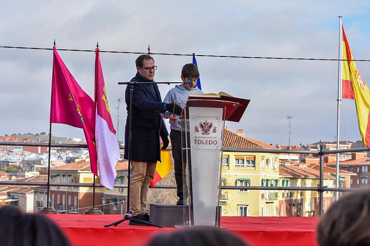 La explanada de las escaleras mecánicas de Recaredo se ha convertido esta mañana en el escenario principal del homenaje a la Constitución en Toledo. Convocados por la Concejalía de Educación del Ayuntamiento, más de 300 alumnos de 5º y 6º de Educación Primaria han participado en una lectura continuada de los artículos del texto constitucional, una actividad diseñada para acercar a los más jóvenes al marco legal que rige la convivencia en España.
