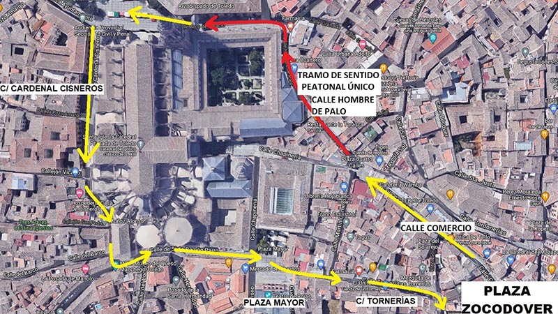 La Policía Local ha señalizado el recorrido recomendado para facilitar la orientación de los viandantes. El circuito comienza en la Plaza de Zocodover, continúa por las calles Comercio y Hombre de Palo hasta la Plaza del Ayuntamiento, y regresa por las calles Cardenal Cisneros, Sixto Ramón Parro, Plaza Mayor y Tornerías. Desde este punto, los peatones pueden optar por diferentes calles para salir de nuevo a Comercio o llegar a la plaza de Zocodover.