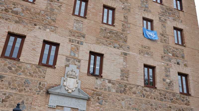 Las Cortes de Castilla-La Mancha exhiben durante la jornada de este viernes la bandera de Naciones Unidas en la ventana de Presidencia de su sede del Convento de San Gil en Toledo, para conmemorar el 80 aniversario de la organización internacional.