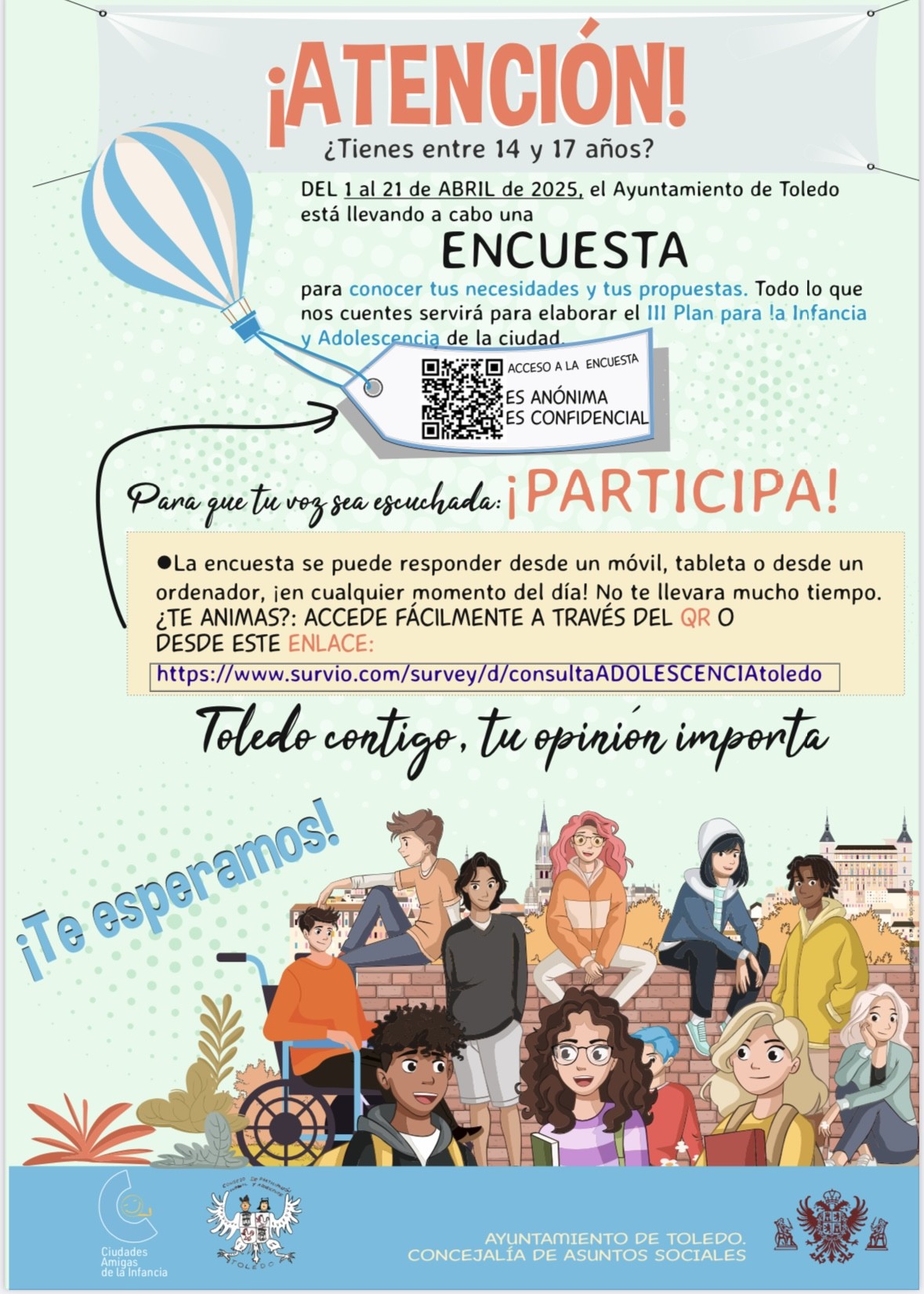 Además, se ha habilitado una consulta abierta, anónima y confidencial, dirigida a jóvenes de 14 a 17 años, con la colaboración del Consejo de Participación Infantil y Adolescente de la ciudad. A través de esta encuesta, se busca conocer su situación, preocupaciones, necesidades y propuestas.