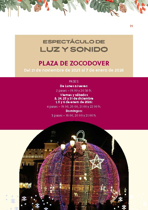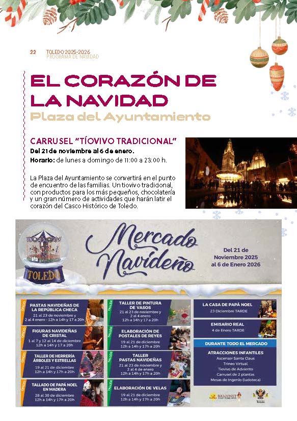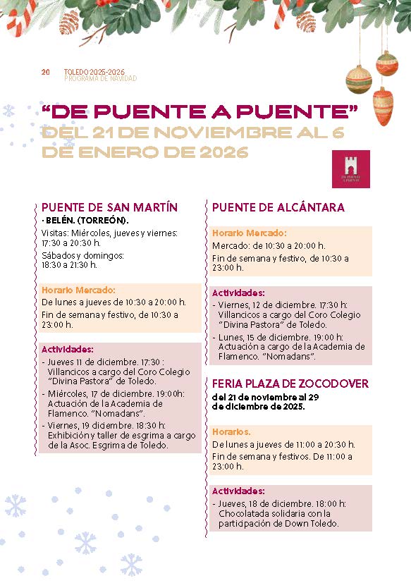 La iniciativa Navidad “De Puente a Puente” volverá a dinamizar la senda que une los puentes de Alcántara y San Martín, con mercadillos, actividades al aire libre y el tradicional espectáculo de luz y sonido en la plaza de Zocodover, un evento que ha cosechado un gran éxito en ediciones anteriores.