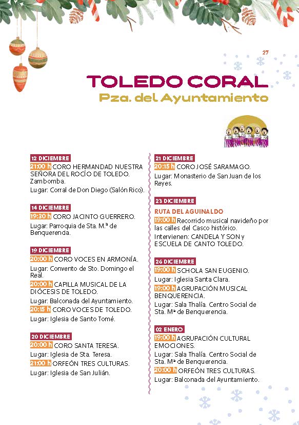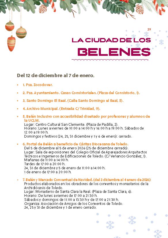 No faltarán citas emblemáticas como el Toledo Coral o la visita a los belenes repartidos por distintos espacios patrimoniales, una tradición muy arraigada en la ciudad. También regresará la Cabalgata de Sus Majestades los Reyes Magos de Oriente, que recorrerá las calles repartiendo ilusión, magia y esperanza entre pequeños y mayores.