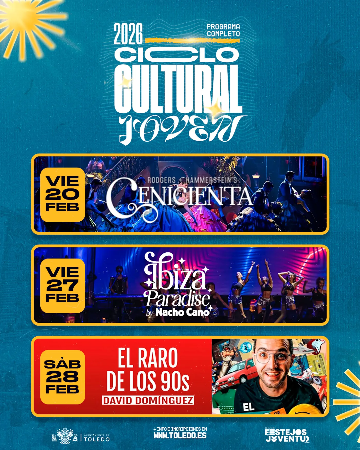 La programación arrancará el viernes 20 de febrero con la asistencia al musical ‘La Cenicienta’, dirigida especialmente a los más jóvenes. Continuará el viernes 27 de febrero, día en el que los participantes podrán disfrutar del musical ‘Ibiza Paradise’ de Nacho Cano en Madrid, y el día siguiente, el sábado 28 de febrero, tendrá lugar el primer monólogo ‘El raro del os 90s’ de David Domínguez.