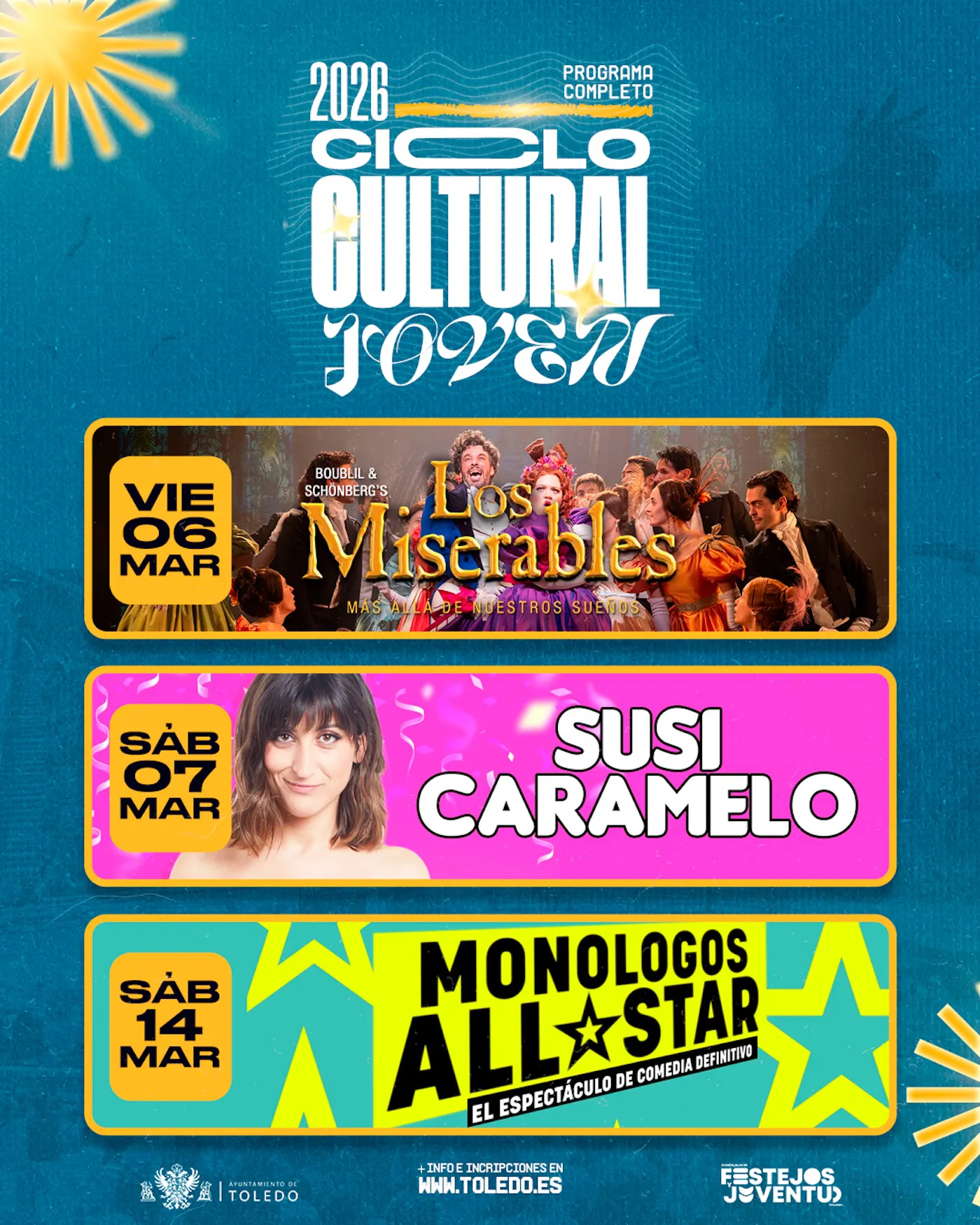 Ya en el mes de marzo, el viernes 6 los jóvenes podrán apuntarse para ir a ver la obra de teatro ‘Los Miserables’ en Madrid; el sábado 7 de marzo actuará la humorista ‘Susi Caramelo’ también en la Sala Thalía y el sábado 14 se celebrará el espectáculo de comedia ‘Monólogos All Star’, una propuesta que según García-Toledano, “ya tuvo gran acogida en ediciones anteriores y que este año contará con nuevos monologuistas”.