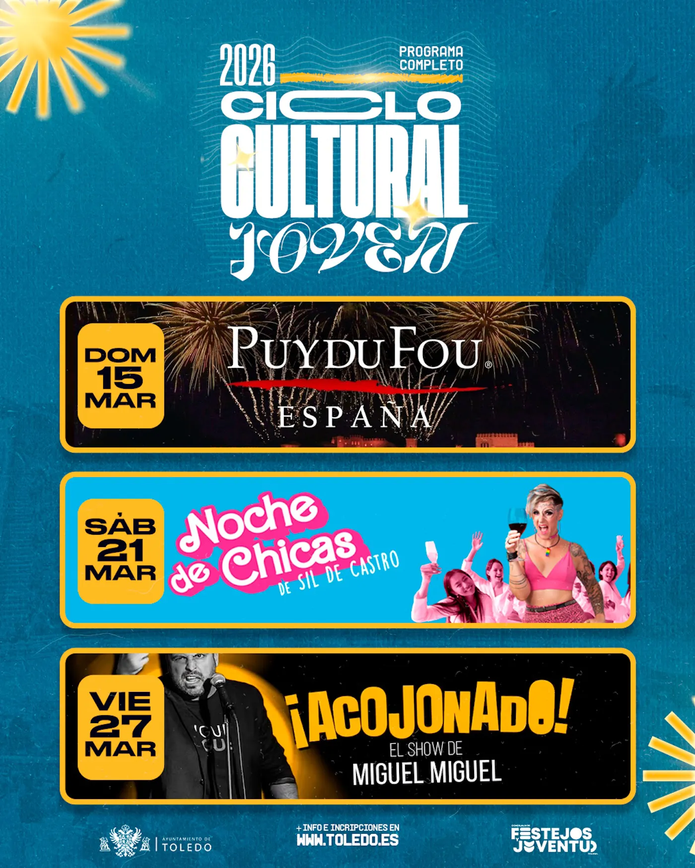 Además, el domingo 15 de marzo, se realizará una visita a Puy du Fou, “para acercar la cultura a nuestros jóvenes”. Las actuaciones incluidas en este ciclo continuarán el sábado 21 de marzo en la Sala Thalía con Sil de Castro y el espectáculo ‘Noche de Chicas’; y finalizarán el viernes 27 de marzo en la misma ubicación con el Festival de Comedia de Miguel Miguel, ‘¡Acojonados!’.