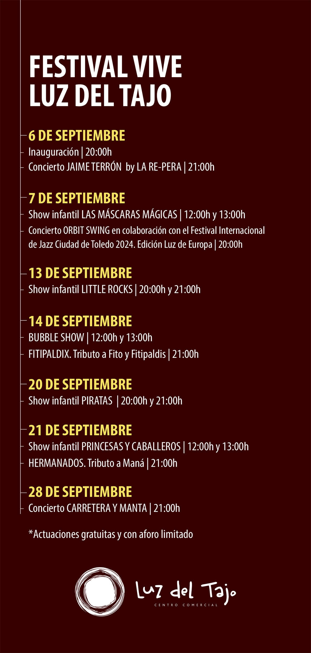 - Concierto HERMANADOS. Tributo a MANÁ | 21:00h. La banda Toledana Hermanados hará vibrar a todos los asistentes a Luz del del Tajo al ritmo de los mejores temas de siempre de Maná en un imperdible concierto en vivo.
