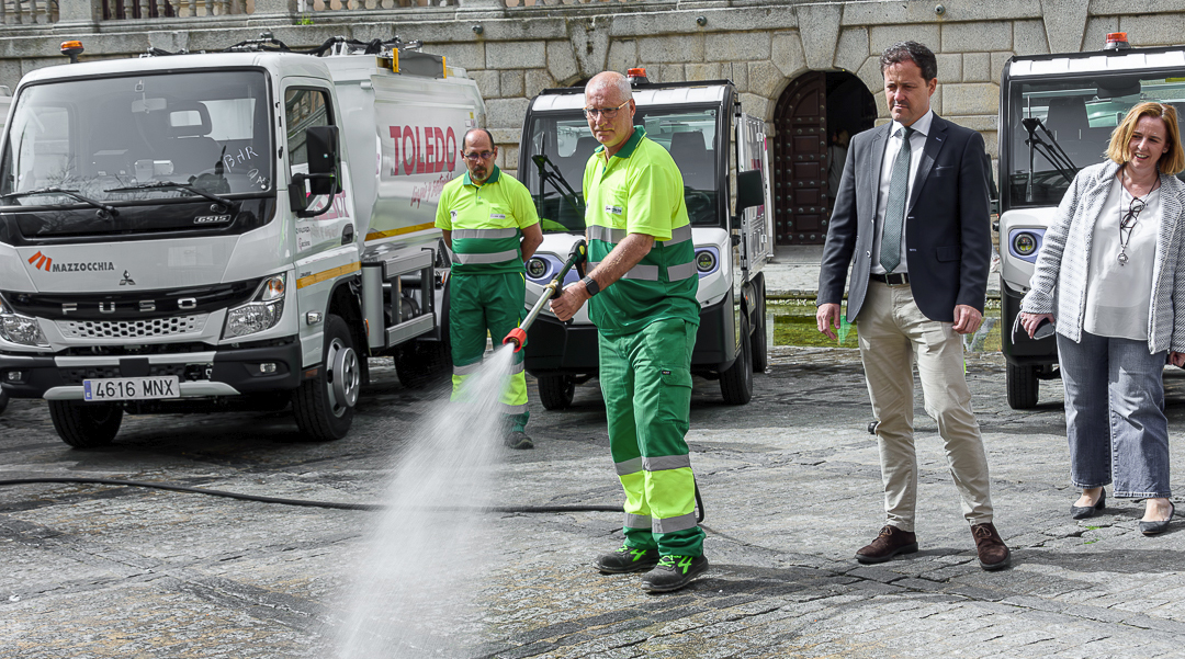 El alcalde de Toledo, Carlos Velázquez, presentaba esta mañana, junto a la concejala de Obras y Servicios, Loreto Molina, una innovadora flota de vehículos para la recogida de residuos y baldeo en el Casco Histórico de la ciudad, describiéndolos como «más eficientes, más sostenibles, menos contaminantes y, en resumen, mejores».