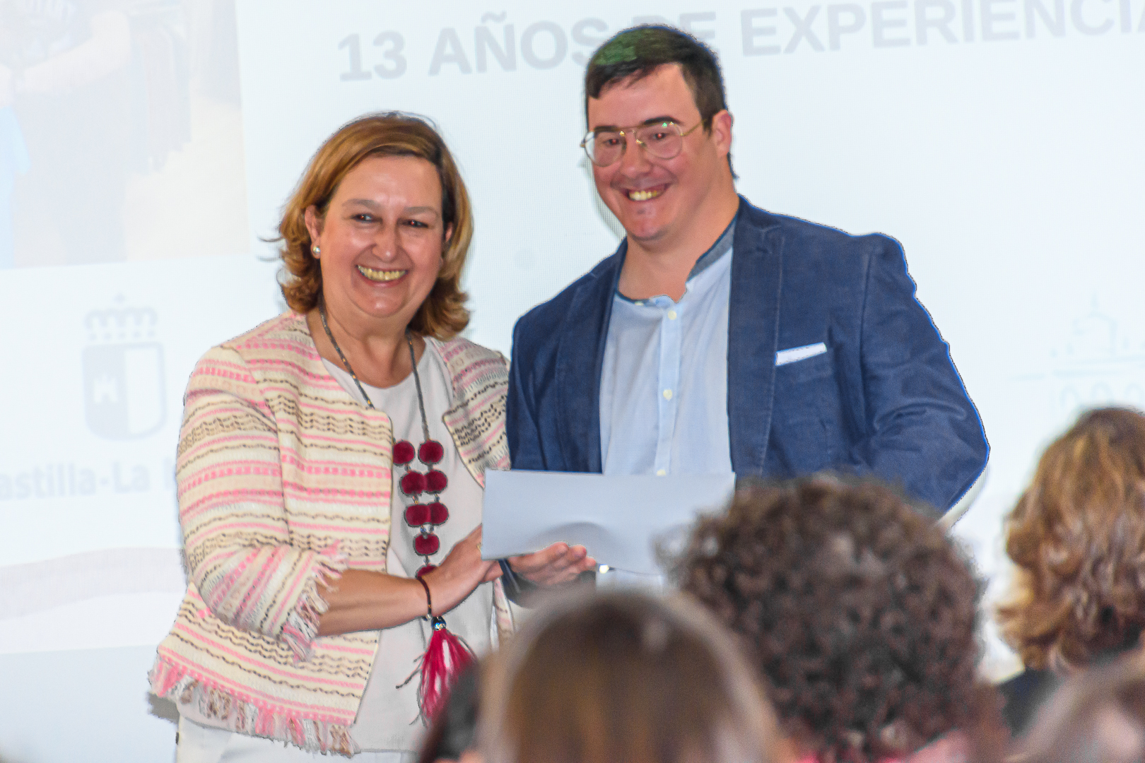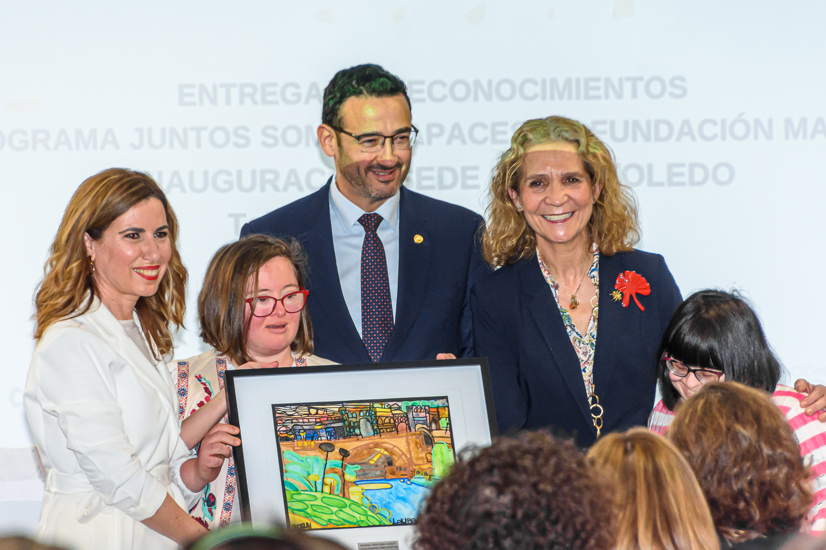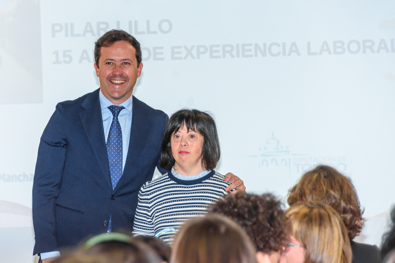 Durante la ceremonia de inauguración de la nueva sede de Down Toledo, el alcalde de Toledo entregó un reconocimiento a Pilar Lillo, usuaria de Down Toledo que ha trabajado durante 15 años en el Hospital Quirón. También fueron distinguidos por sus trayectorias laborales José Luis García, empleado de H&M, y Marta Díaz-Guerra, trabajadora de Kiabi.